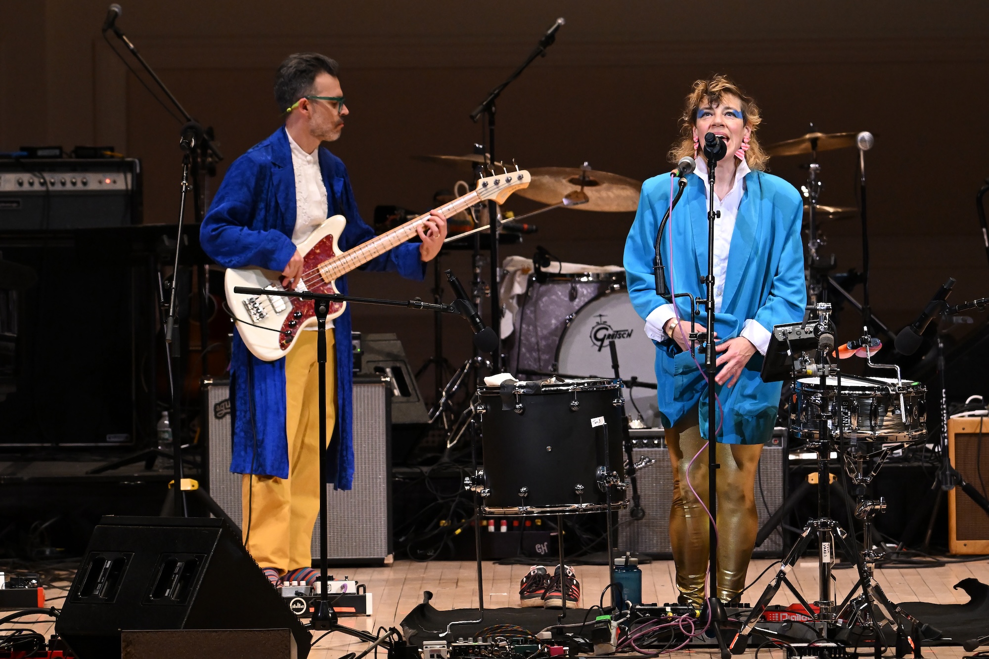 Dressed in their own combinations of yellow/gold and blue, mirroring the colors of the Ukrainian flag, tUnE-yArDs’ Merrill Garbus and Nate Brenner performed “How Big is the Rainbow?” Garbus said because it was her birthday, they would be backed by her ‘self-dubbed” backing vocalist the “yArD Birdies,” featuring Anderson, Russell, and Gina Gershon, for “Limelight.”